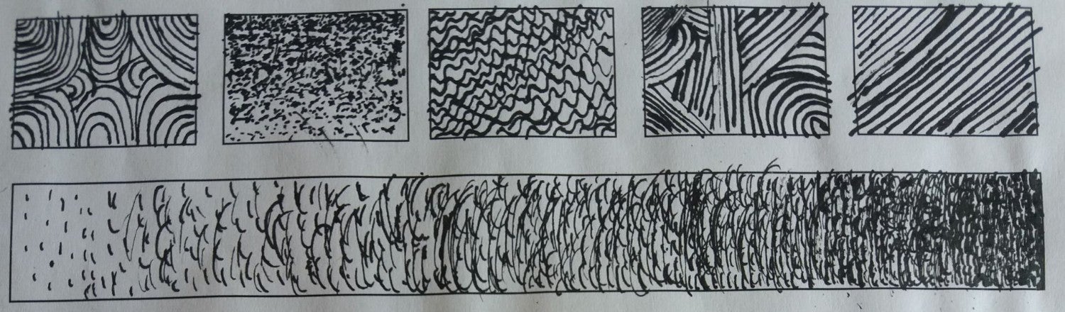 Bij dit hoofdstuk werkte wij met oost-Indische inkt. Om dat dat grotendeels nieuw was voor ons gingen we eerst oefenen met arceren. We moesten vijf verschillende arceringen en een overgang van licht naar donker maken. Ik vond dat wel een leuke opdracht, omdat het lekker makkelijk was en het kon niet echt fout gaan (behalve als je het inktpotje over het blad zou laten vallen). ( Voor resultaat zie afbeelding 1)